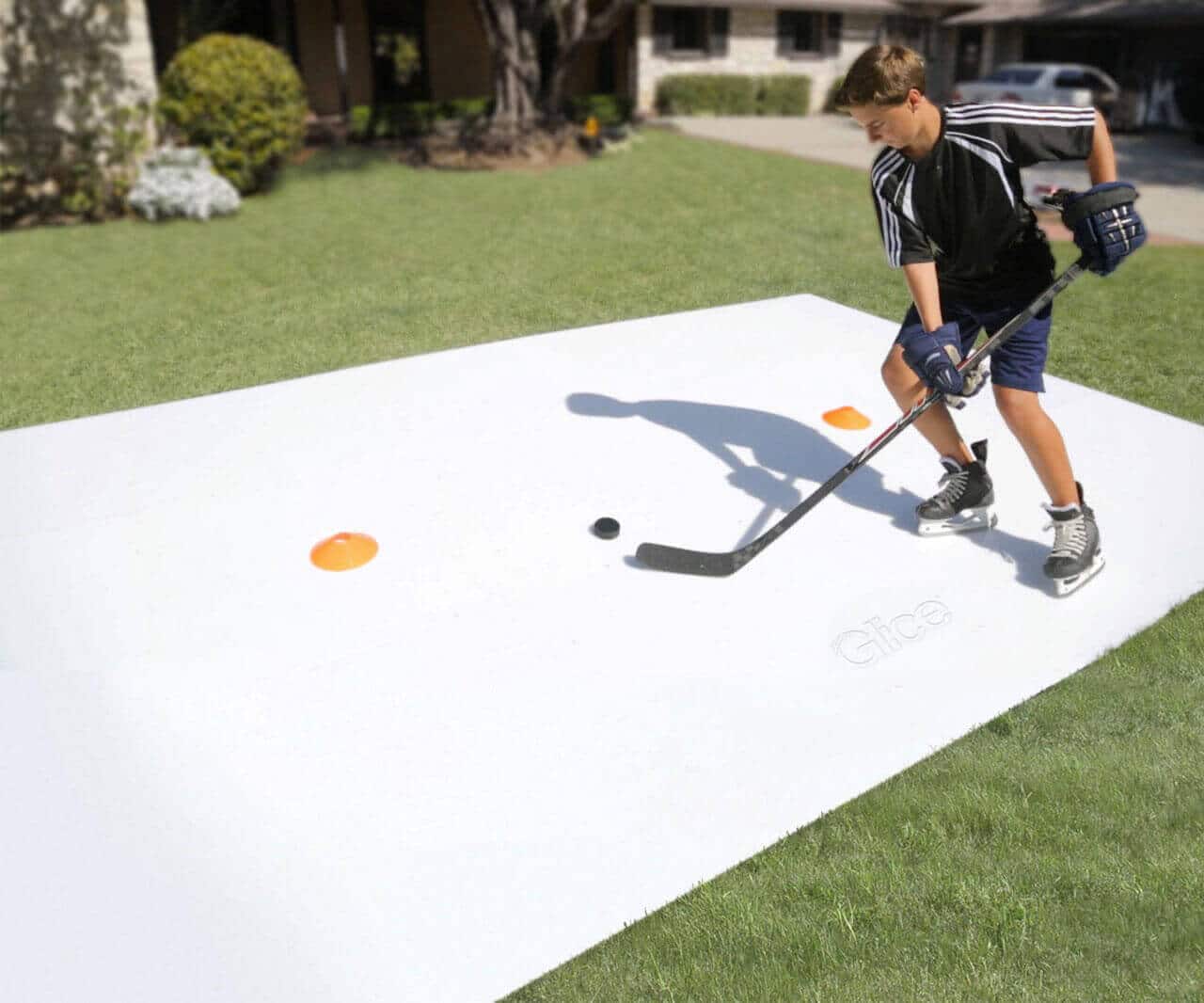 Small synthetic rinks e.g. 4×3 m (12×9.5 ft), can be great to practice stickhandling and shooting, while medium sizes e.g. 6×3 m (19×16 ft) add enough space to train skating and passing as well. Larger rinks, like 6×6 m (19×19 ft) or 10×5 m (33×16 ft), are great for cone drills, goaltending, and 1:1 or 1:2 scenarios.